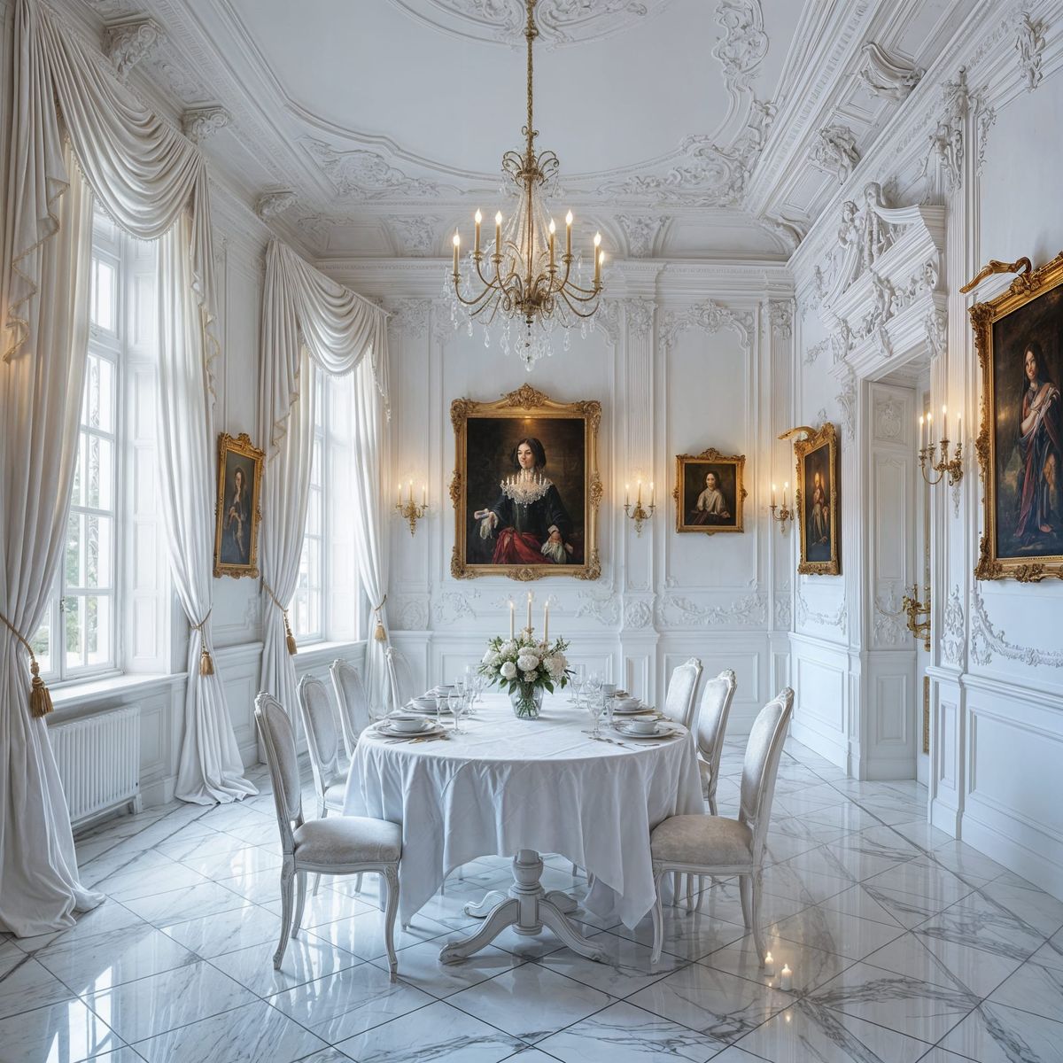 This image shows a bright, expansive Baroque dining room bathed in white. The only color comes from a candle flame. White drapes adorn the windows, and the table is set with white dishes.