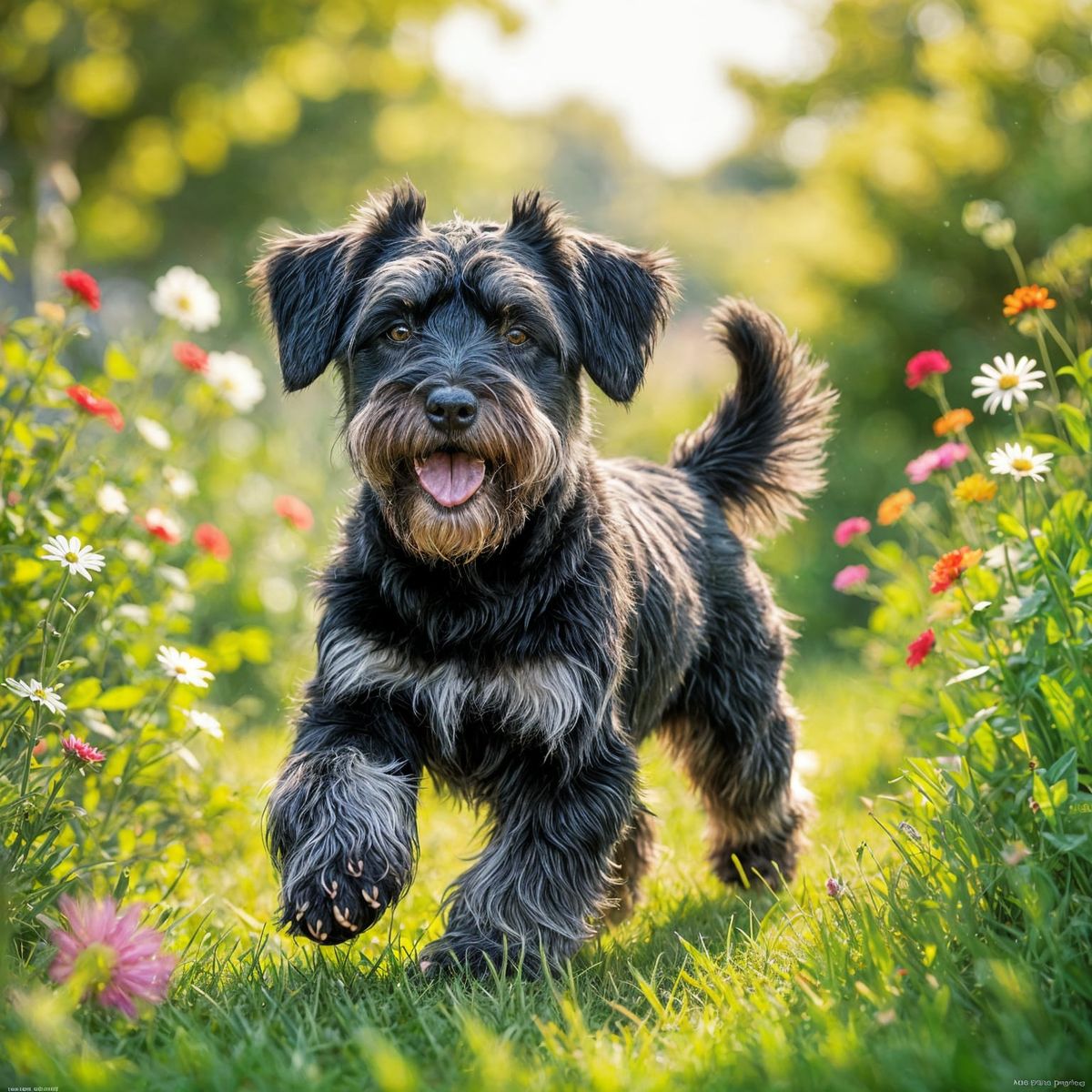 This image shows a black giant schnauzer-like dog playing in a vibrant summer garden. The artwork is highly detailed with a splash art style and dynamic side lighting.