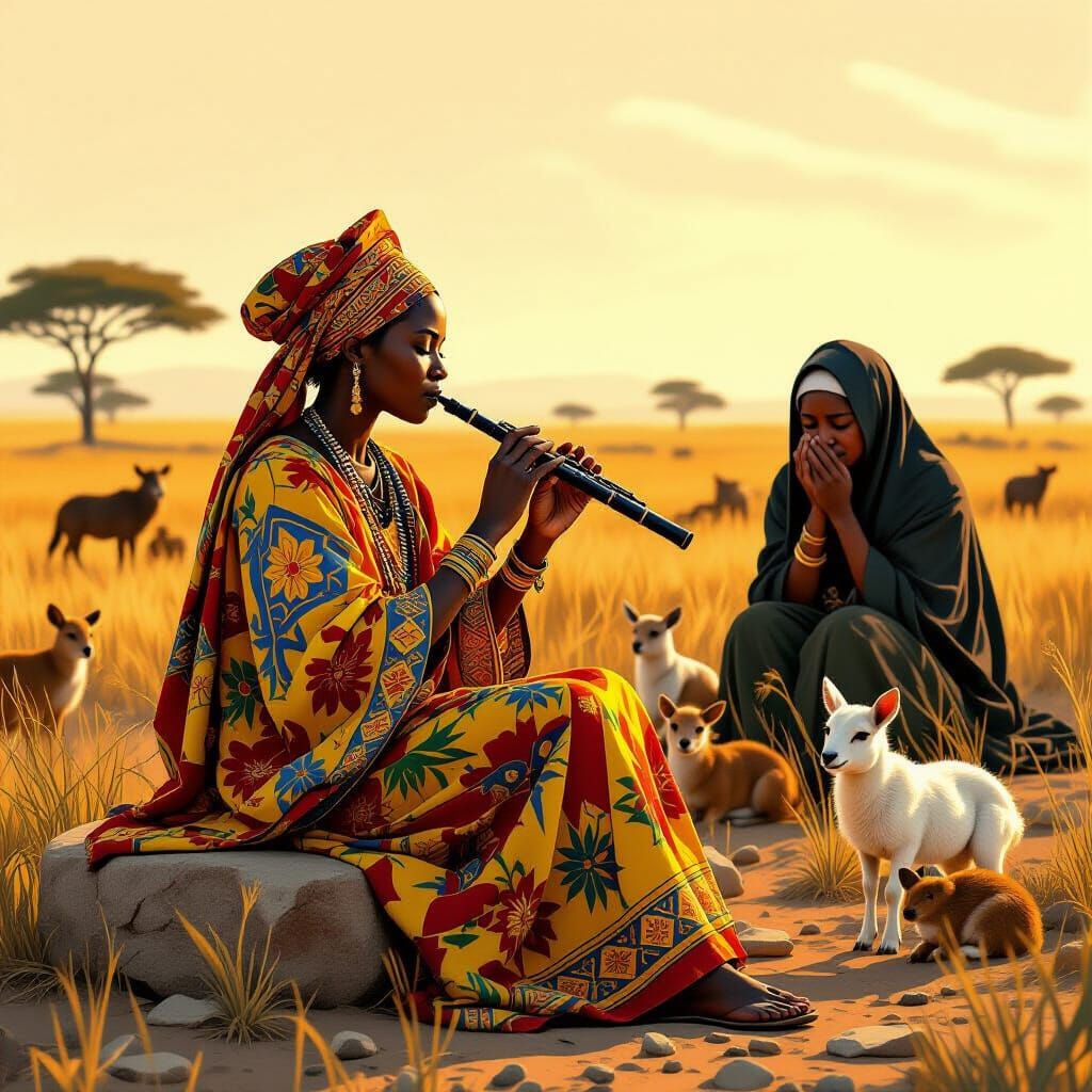 This image shows a young African woman playing a flute in a savannah. Animals gather as a woman weeps in the background, visualized with warm light and earthy tones.