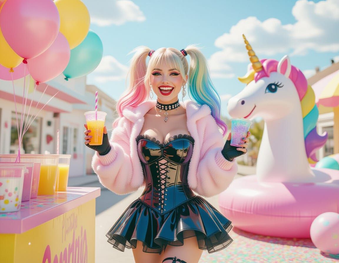 This photorealistic image shows a joyful pastel goth woman with rainbow hair and a unicorn hoodie serving drinks at a vibrant lemonade stand. She's surrounded by festive decorations and has a bubbly, energetic attitude.