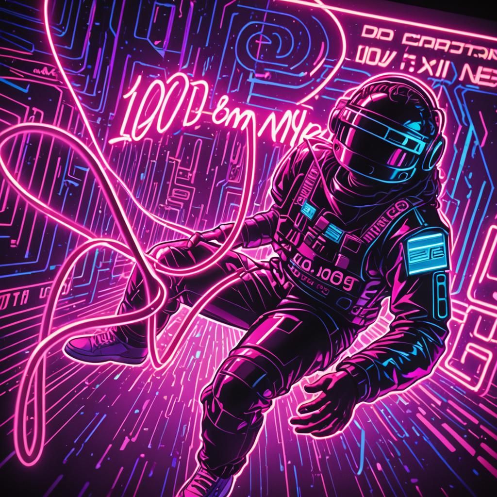 A striking picture of a cassette tape with a neon label, set against swirling pink and purple lights. The image is in a retro-futuristic synthwave aesthetic, with a vibrant, moody atmosphere.