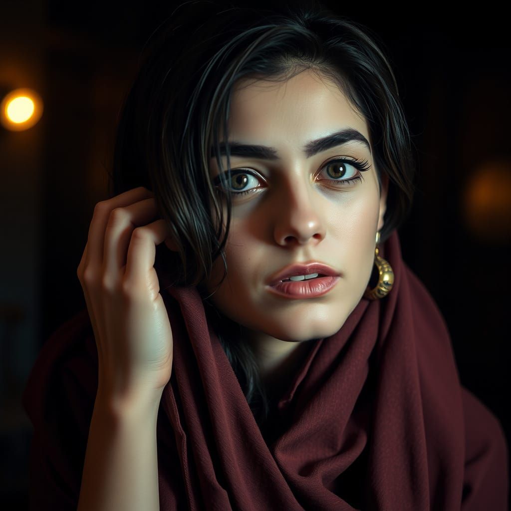A striking picture of an Iranian woman in a dramatic setting. The image features cinematic lighting, vivid colors, and high contrast, with a film grain effect.