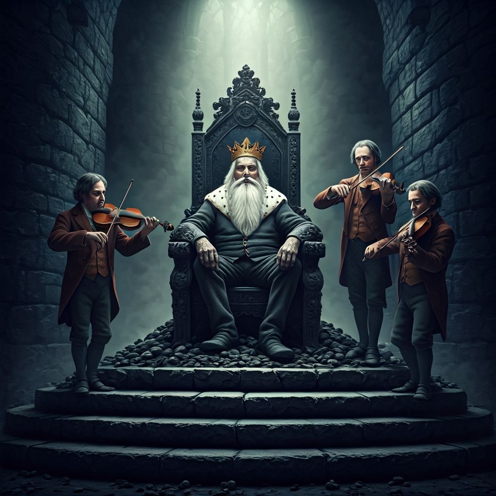 This image shows Old King Cole on a coal throne in a dim castle, accompanied by three fiddlers playing sad music. The scene is depicted with dramatic lighting and a gritty, realistic style, capturing a dark fantasy aesthetic.