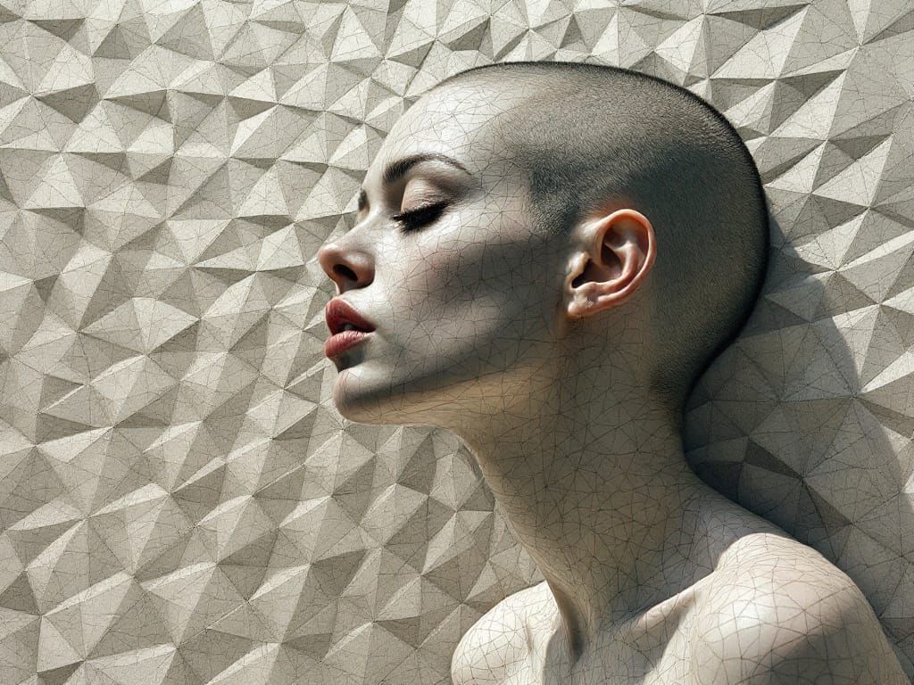 tessellated pattern that represents the agony of her soul caught in a moment of dramatic pause her facial expression changes as she realises something about a vanishing point trompe l'oeil she just wants that time back again therefore she's shaved her head