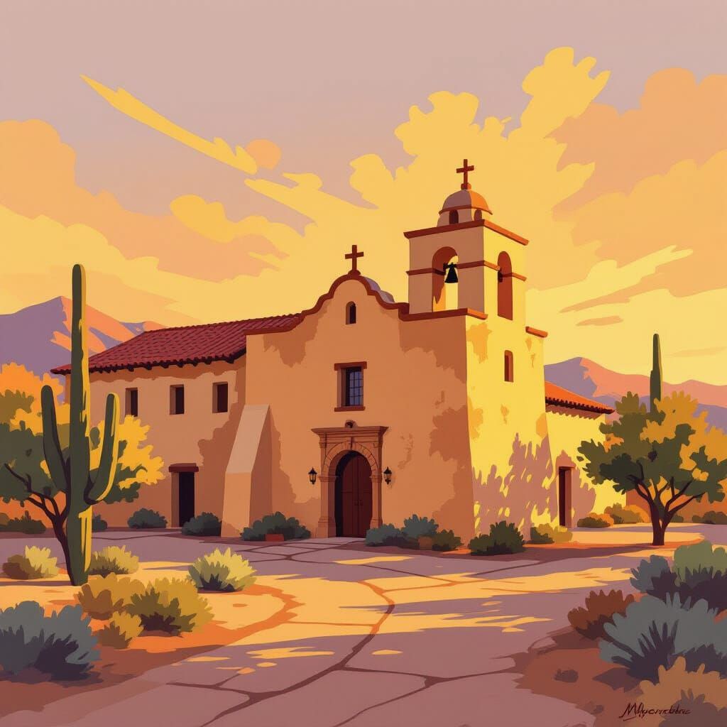 This image captures the Adobe Mission Church bathed in warm, golden hour light. Soft oranges and purples fill the sky, with dramatic shadows highlighting the adobe walls. Rendered in a soft, atmospheric style.