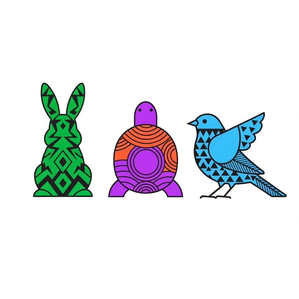 This image showcases a minimalist t-shirt design with three unique pet silhouettes. Each animal is filled with abstract geometric patterns in bold, flat colors, set against a clean white background.
