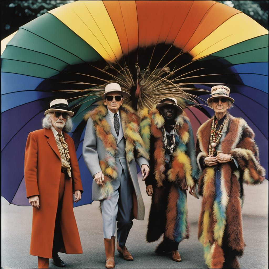 This vibrant image captures a whimsical scene of a person adorned in a colorful, intricate feathered headdress, surrounded by lush trees and vibrant flowers. The photorealistic style and playful expression evoke a sense of joy and celebration.
