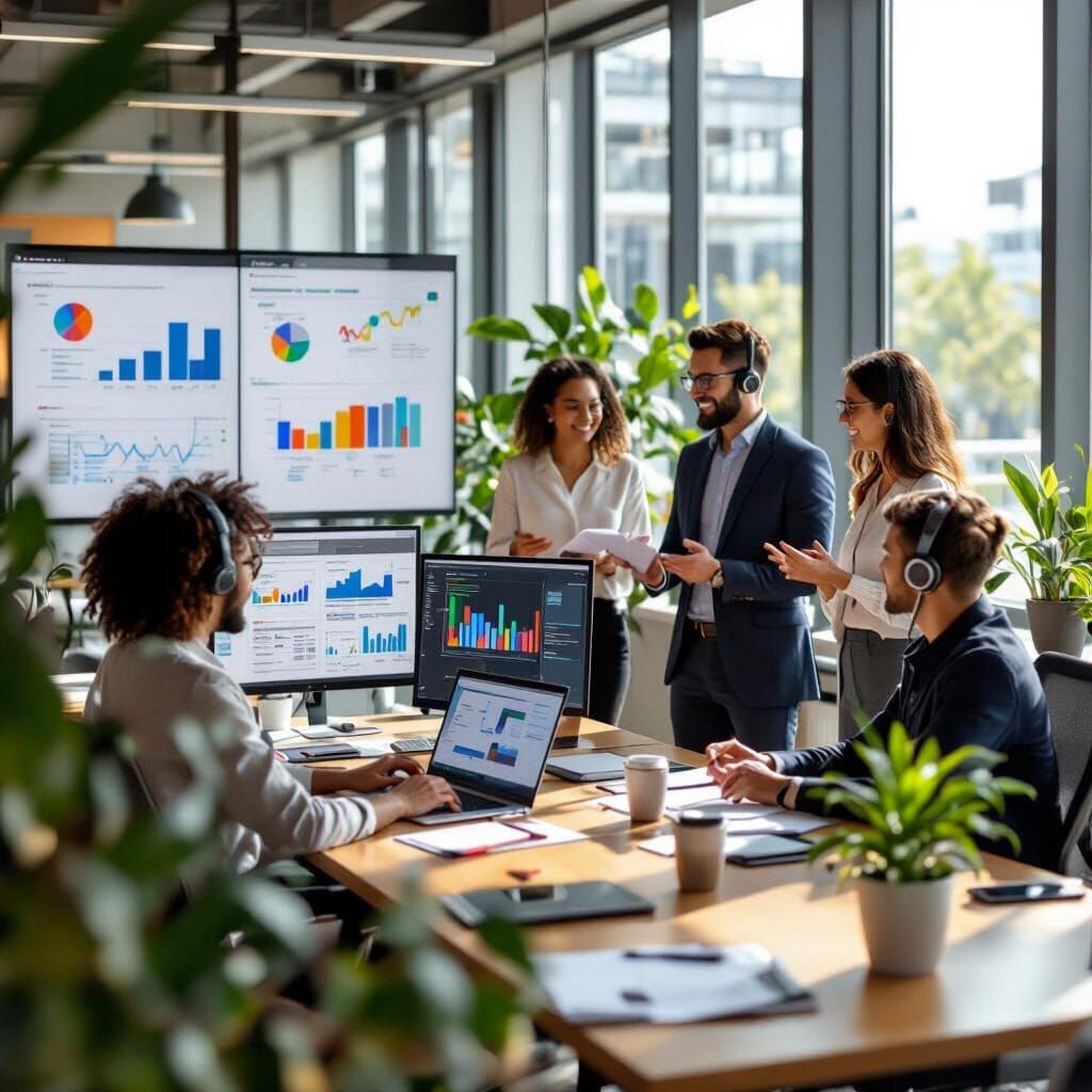 This hyperrealistic image depicts a bright, modern office with diverse professionals engaged in work. Features cinematic lighting and a wide-angle view, emphasizing productivity and teamwork.