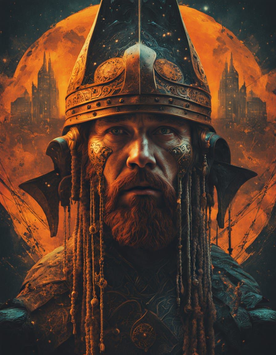 A composite image of a Viking god's face with digital eyes, set against a hyperdetailed cityscape. The artwork features transparent layers, a celestial orange moon, and post-processed elements in a maximalist style.