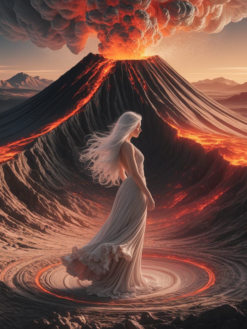 This digital painting features a girl with long white hair in a volcano caldera, with fractal details and double exposure. Ultra HD rendering showcases intricate textures and a warm color palette.