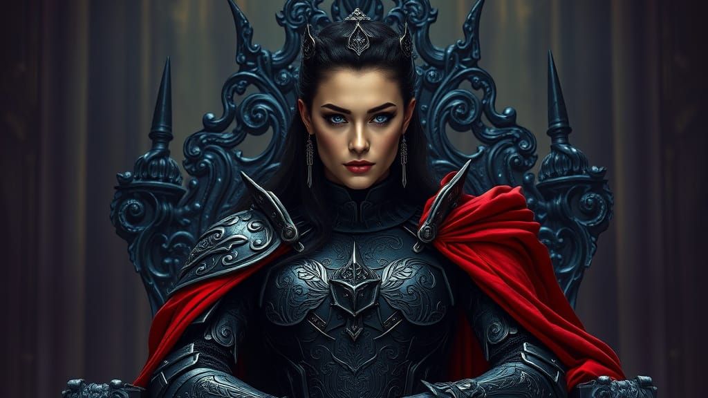 This image depicts a powerful queen warrior in a dimly lit throne room, exuding a sharp and merciless aura. Clad in black armor with intricate engravings and a flowing red cape, she sits upon an iron throne, radiating a commanding presence. Inspired by dark fantasy and cinematic compositions, this 8k res...