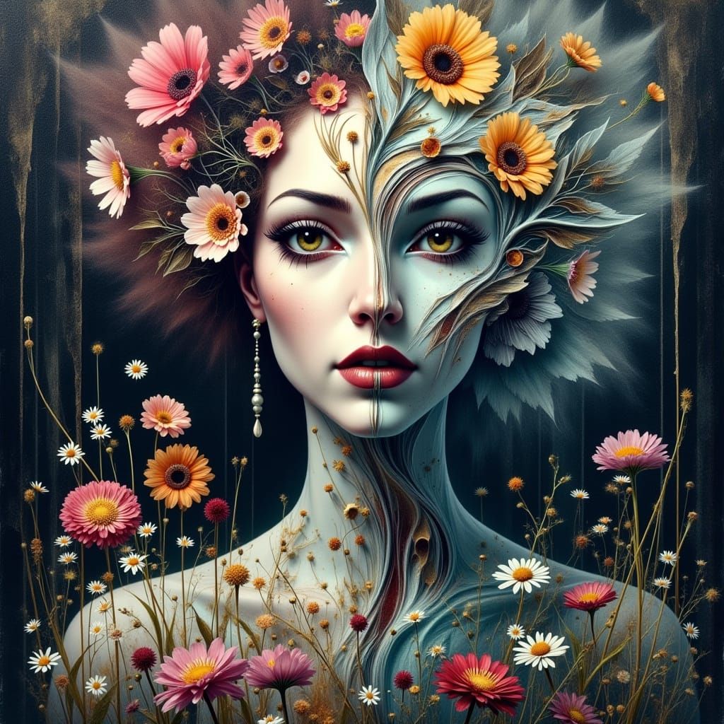 <lora:Morbid:1.0> Goddess made of Blooms, Maiden made of Flowers. Seasonal Sovereignty Of the turning of the Year. Light Half of the Year Flower Goddess expresses her Face Dark Half of the Year Owl Goddess raises her Voice Powerful Blodeuwedd, Both as Flower & as Owl evoking the styles of Gustave Klimt, ...