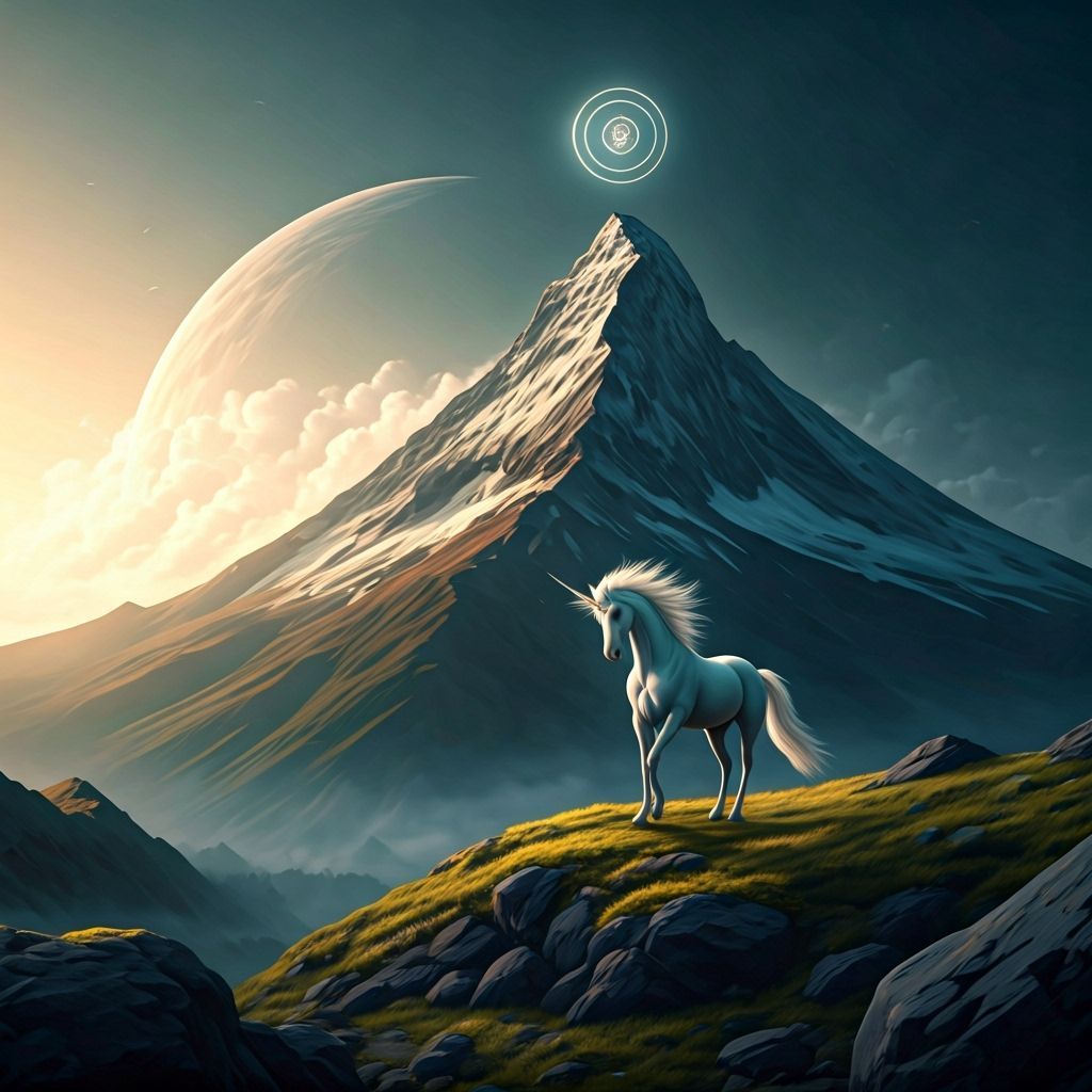 A majestic unicorn stands within a serene mountain landscape. This digital artwork combines airbrush techniques, photoillustration, and matte painting to create a surreal scene.