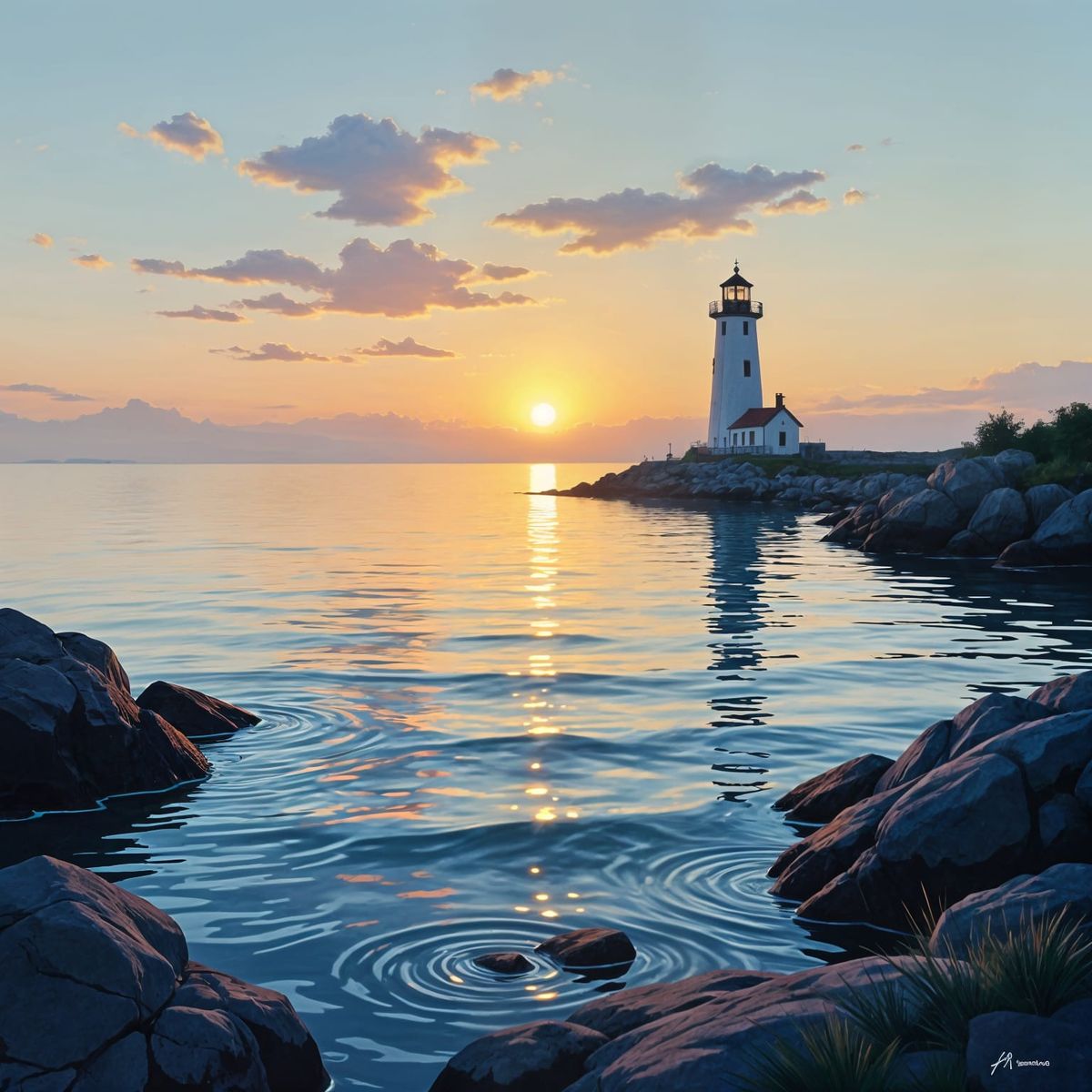 This image shows a serene sunrise over calm seas, with waves gently lapping against the rocky shore. An old lighthouse stands proudly in the distance, a beacon of hope.
