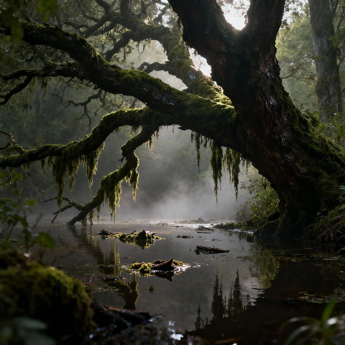 This image captures a moody, atmospheric swamp with ancient mossy trees arching over still, slow-moving water, creating a serene and mysterious scene.