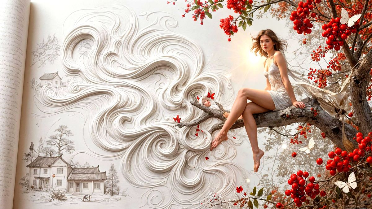 A surrealist masterpiece featuring a pin-up girl on a tree branch against a minimalist white backdrop with blood drops and Asian landscape art. Features dynamic lighting and shadow play.