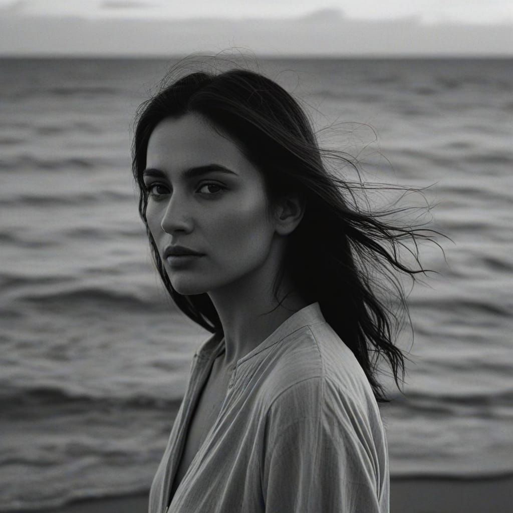 A striking picture of a dark-haired woman standing by the sea with her hair flowing in the wind. The black and white photograph features dramatic lighting and an elegant composition.