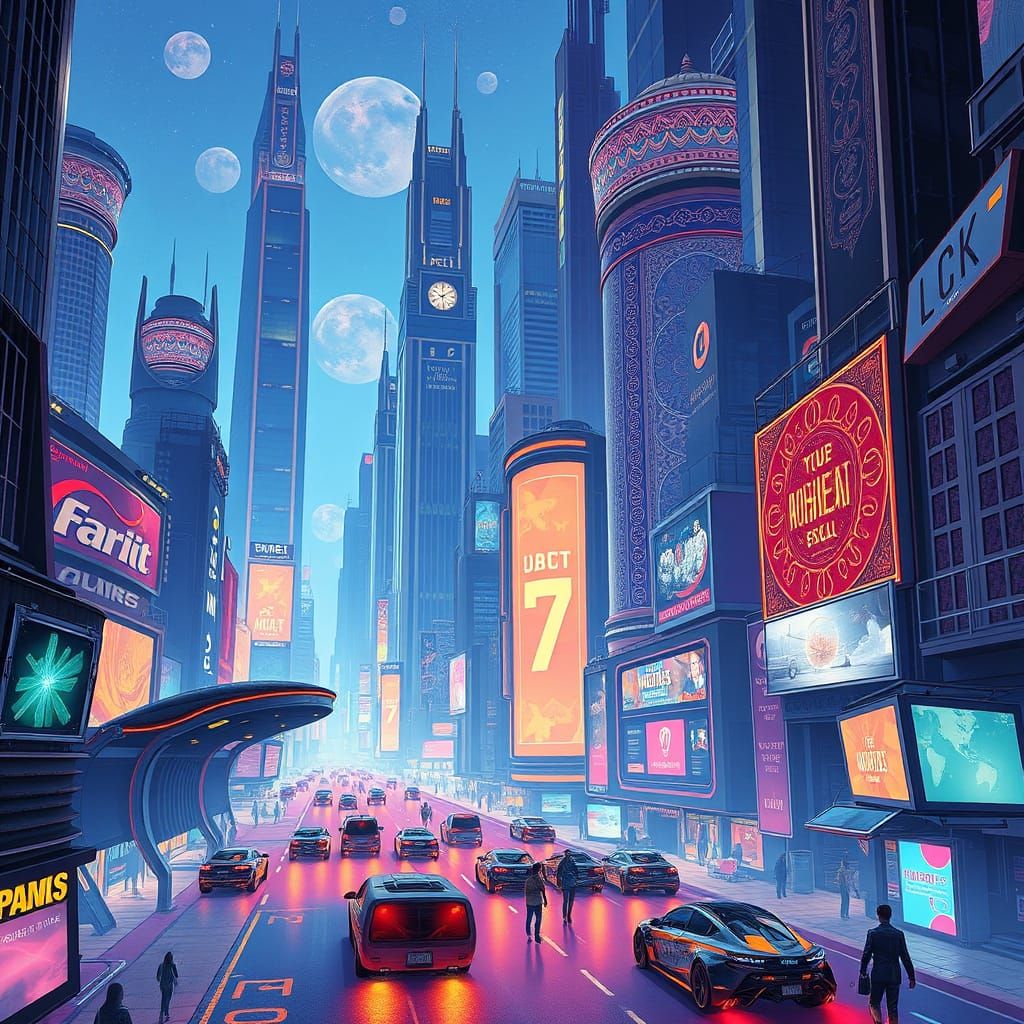 A vibrant futuristic cityscape featuring sleek skyscrapers and holographic advertisements. Hovercars navigate bustling streets filled with robotic pedestrians, all rendered in a cinematic cyberpunk aesthetic.