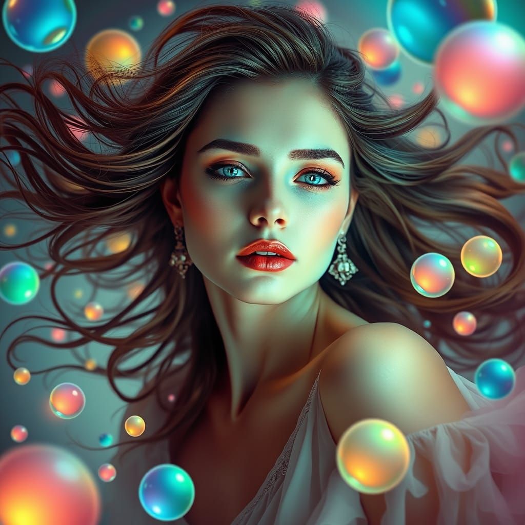 A mesmerizing portrait of a woman with flowing hair amidst glowing orbs. The surreal composition features soft lighting and pastel colors, reminiscent of surrealist paintings.