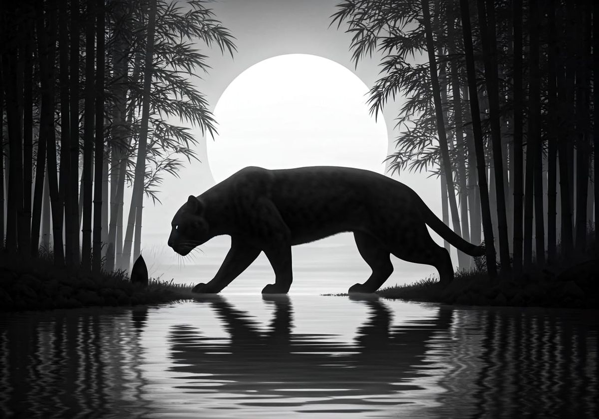 A striking picture of a black panther stalking through bamboo. The monochrome illustration uses light and shadow to create a peaceful atmosphere in a detailed, ultra quality digital art style.