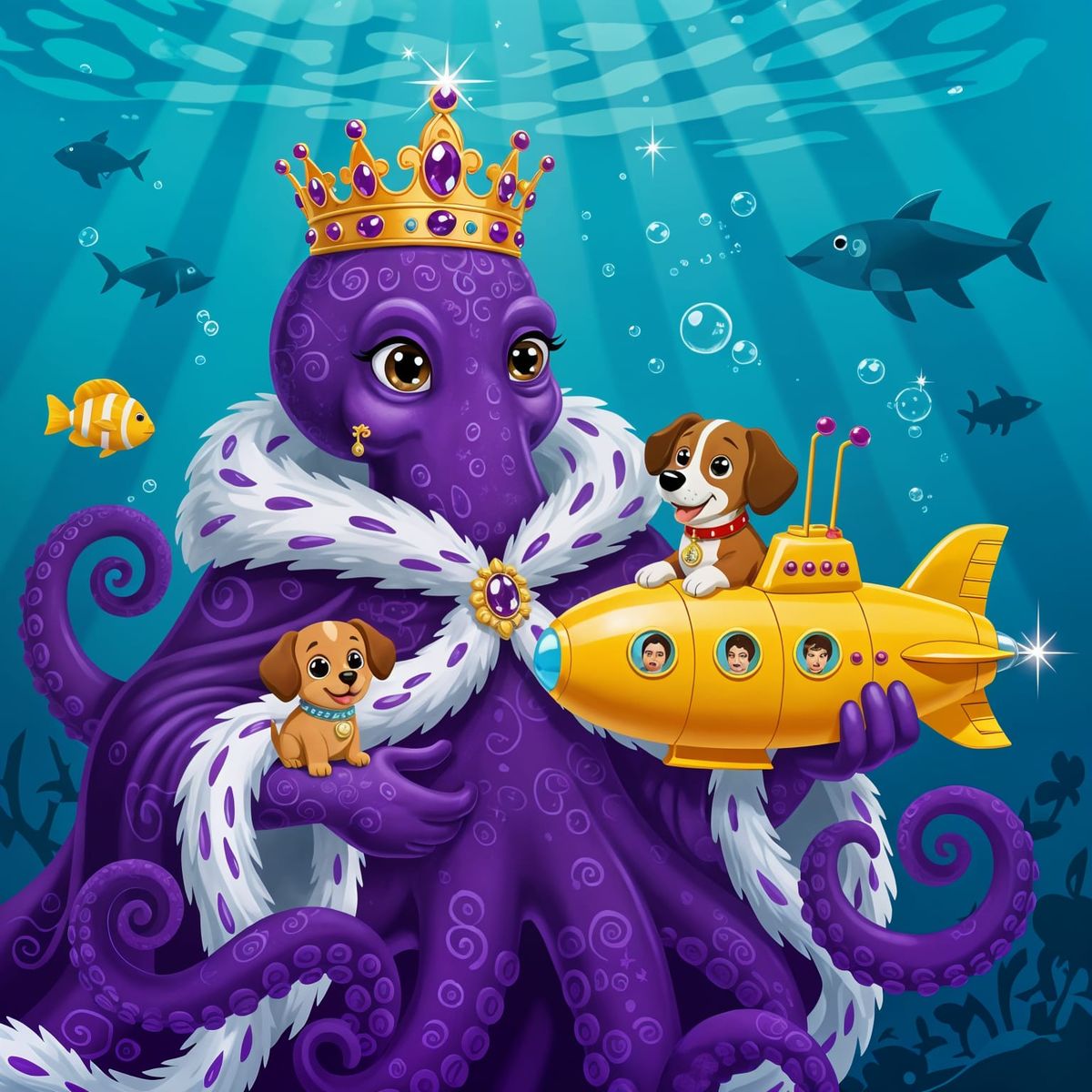 This image shows a majestic octopus in a lavish purple cloak and sparkling crown, accompanied by a small dog and a colorful yellow submarine, blending fantasy and whimsy in a single scene.