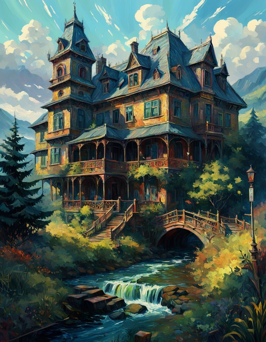 A stunning neo-impressionist oil painting of an old mansion, showcasing intricate details and atmospheric depth in a maximalist digital artwork.