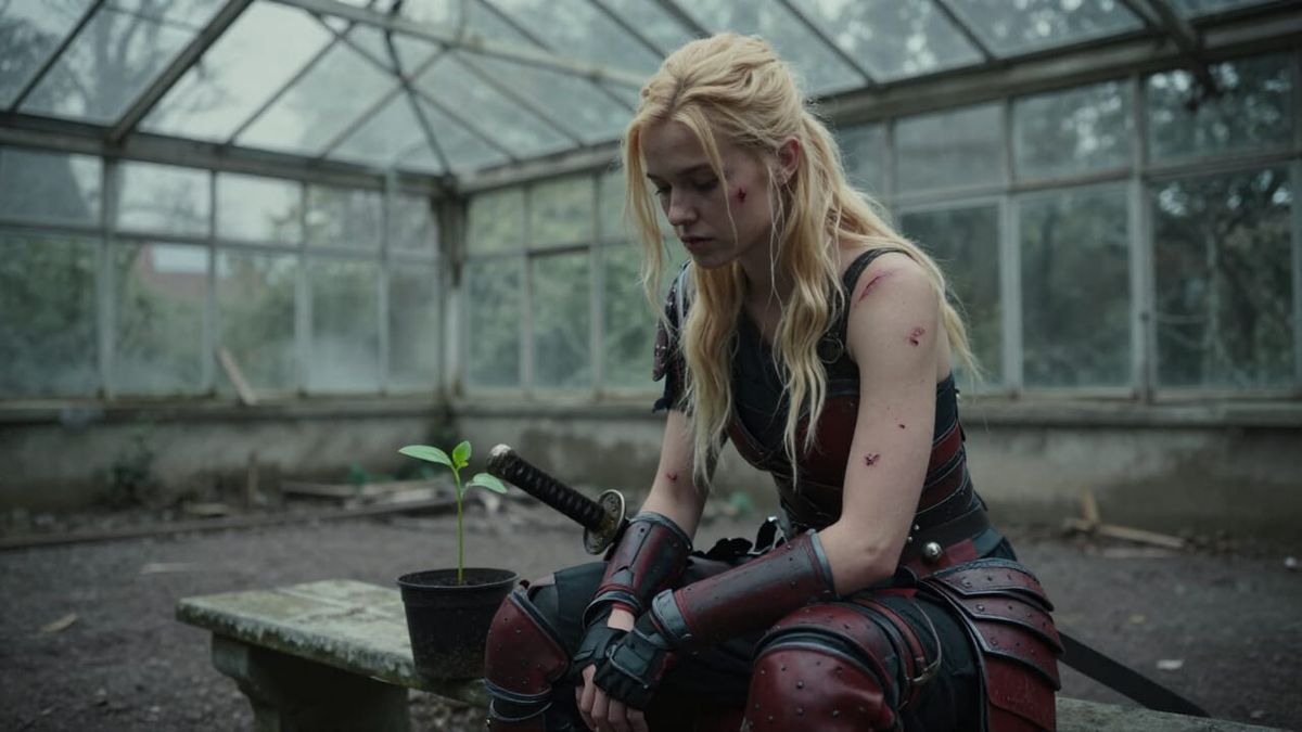 This cinematic image shows a female warrior in armor, resting by a katana in a ruined greenhouse. She gazes at a small green sprout, a symbol of hope against a desaturated, dusty backdrop.