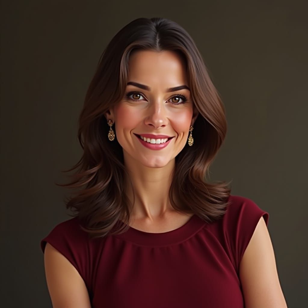 This image depicts a poised woman in a sophisticated bordeaux red dress, exuding confidence and elegance, with a subtle hint of playfulness in her smile, blending traditional European style with modern flair