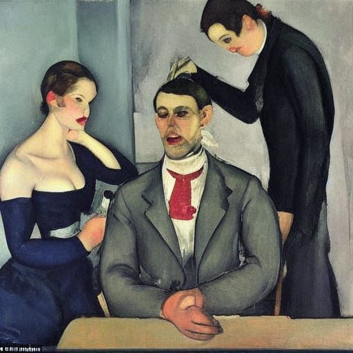 A humorous scene of a foolish vampire attempting to feed on mannequins. This artwork is rendered in the styles of Serebriakova and Modigliani.