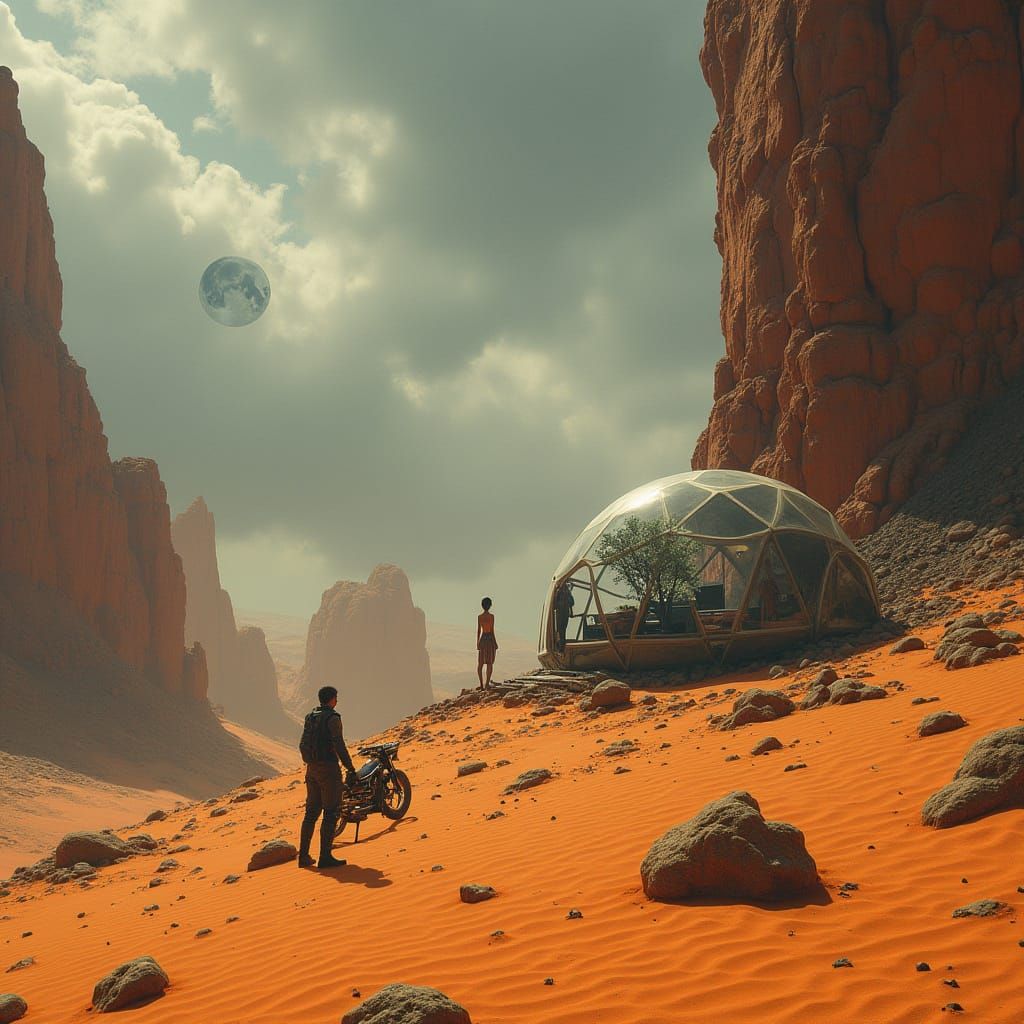This image shows an alien landscape featuring orange sand dunes and basalt formations beneath a stormy sky. A figure in a Fremen suit gazes towards a geodesic dome, while a woman looks out in outrage. The image has photorealistic qualities.