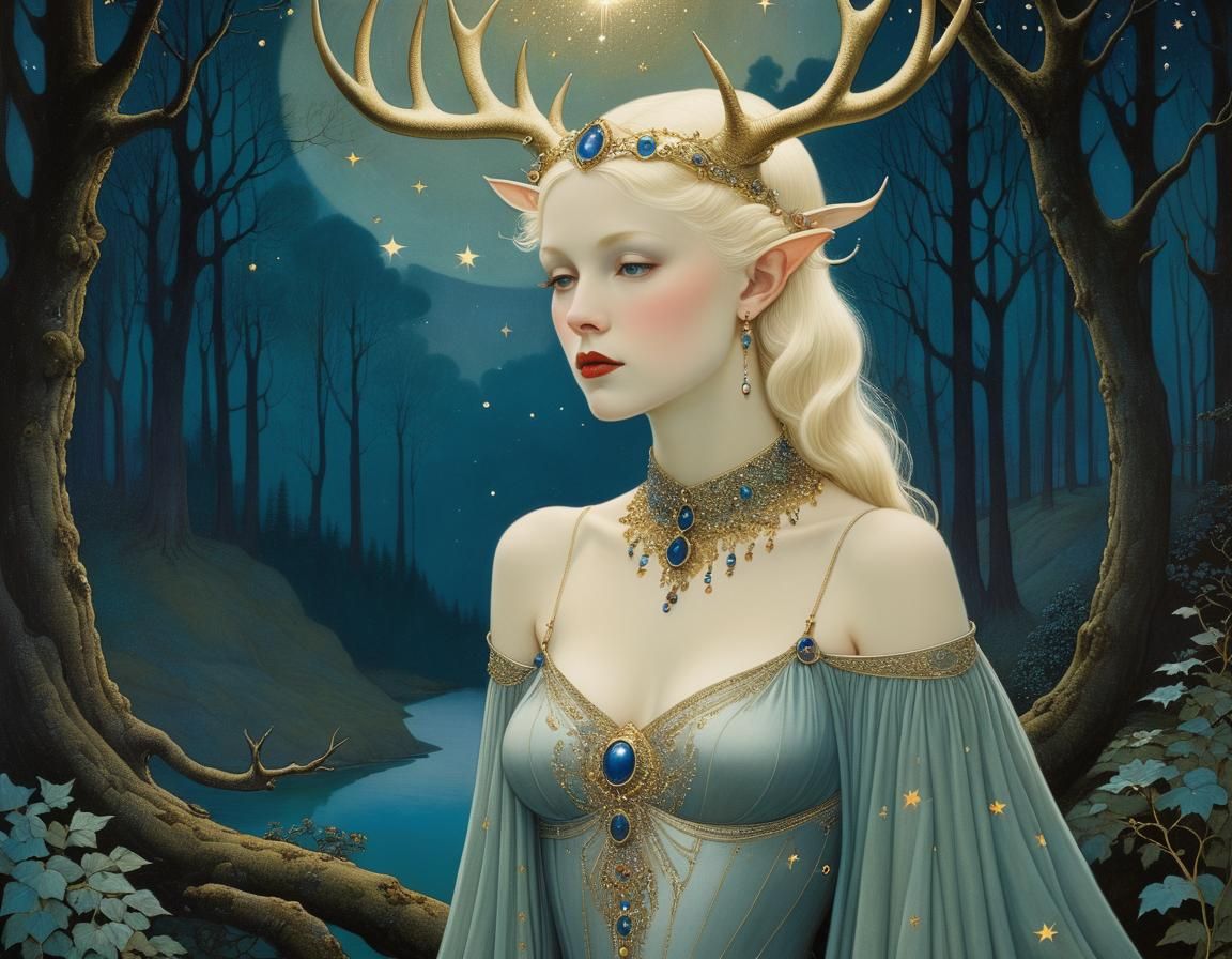 This image shows a tall blonde woman with large stag antlers in a moonlit forest. The artwork features jewel tones and vibrant colors, reminiscent of golden age illustration.