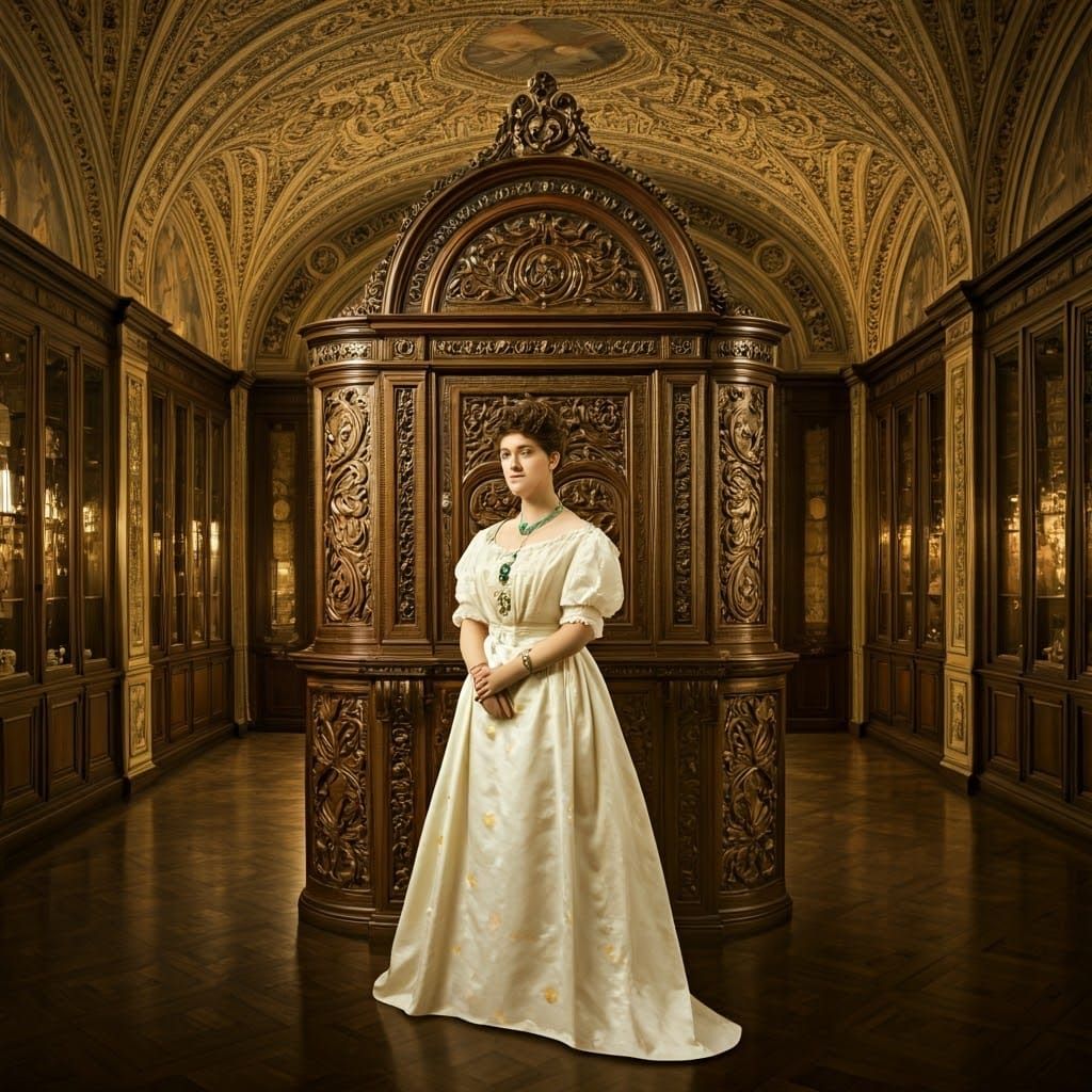 A 19th-century woman adorned with Hungarian Opal Jewellery poses in a dimly lit grand room. The scene evokes Art Nouveau style with ornate frescoes, candelabras, and marble floors.
