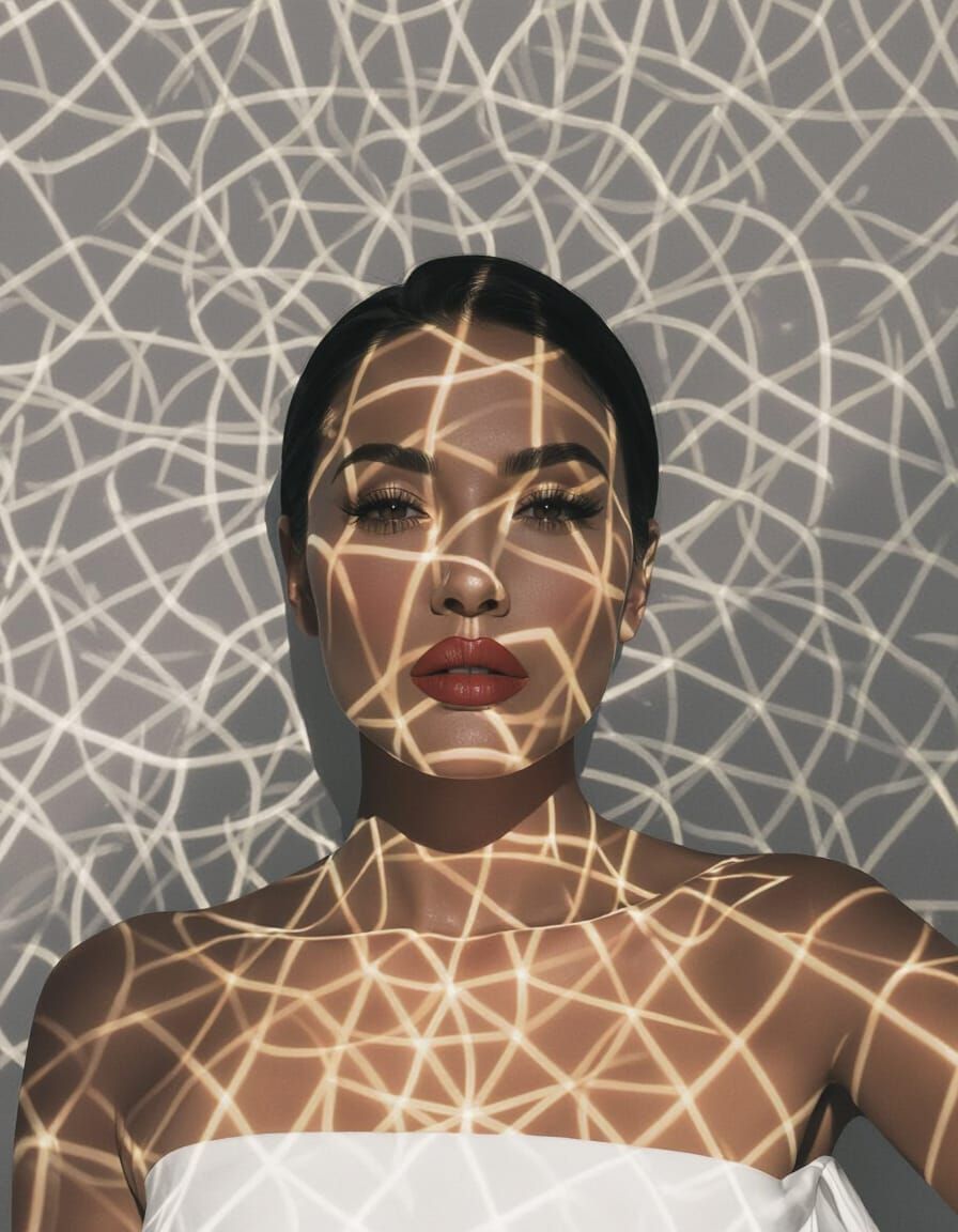 This image features a mature woman with dark hair, bathed in contrasting golden backlight and cool green sidelight. Her intense gaze is partially shadowed, creating a dramatic, ethereal mood.