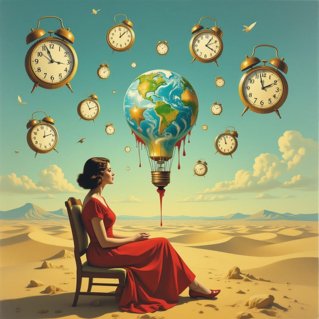 This image depicts a surreal scene of a woman in a landscape filled with melting clocks, rendered in an oil on canvas style with a matte background.