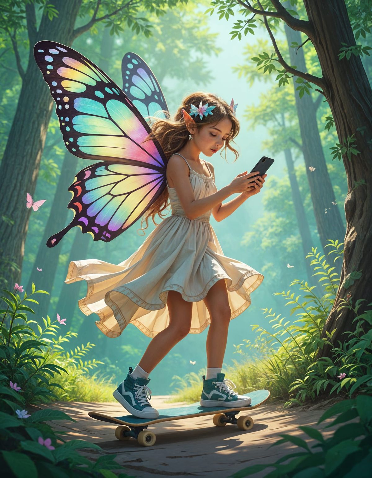 a cute hip cool assertive small vibrant fairy late teen girl with large butterfly wings and natural fluttering dress skateboarding on a smartphone through the forest, epic balance dynamic pose. In an epic scenic fantasy World