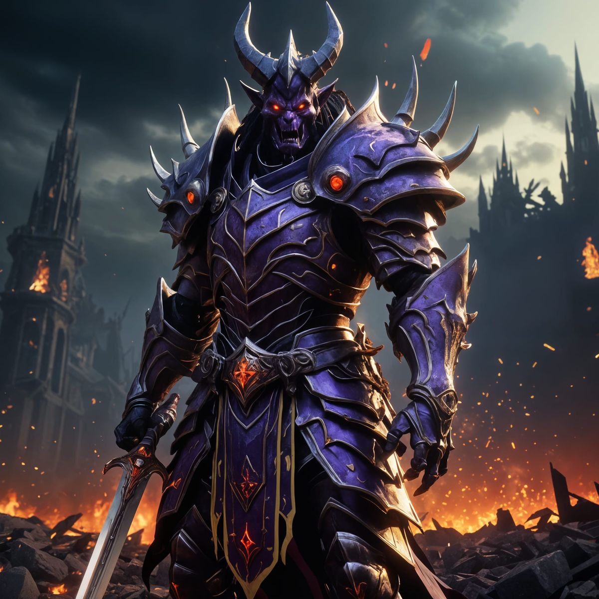 This dramatic dark fantasy artwork depicts a powerful demon lord standing atop a burning battlefield, wielding a massive, rune-engraved sword that crackles with dark energy. The scene is rendered in breathtaking 8K HDR with intricate details and dynamic lighting.