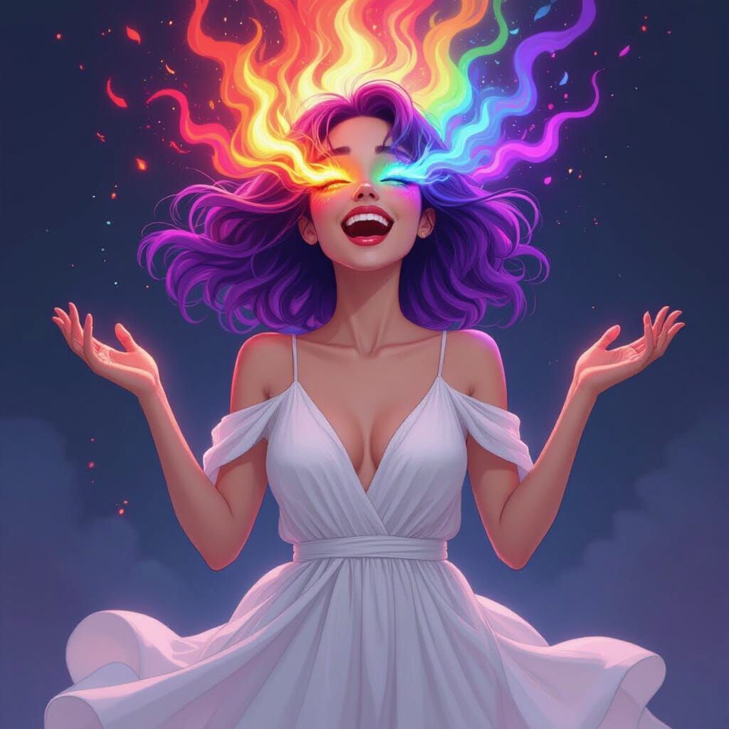 A digital painting of a woman with purple hair and rainbow flames in her eyes. This artwork captures a vibrant and ethereal quality, reminiscent of dreamlike illustrations.