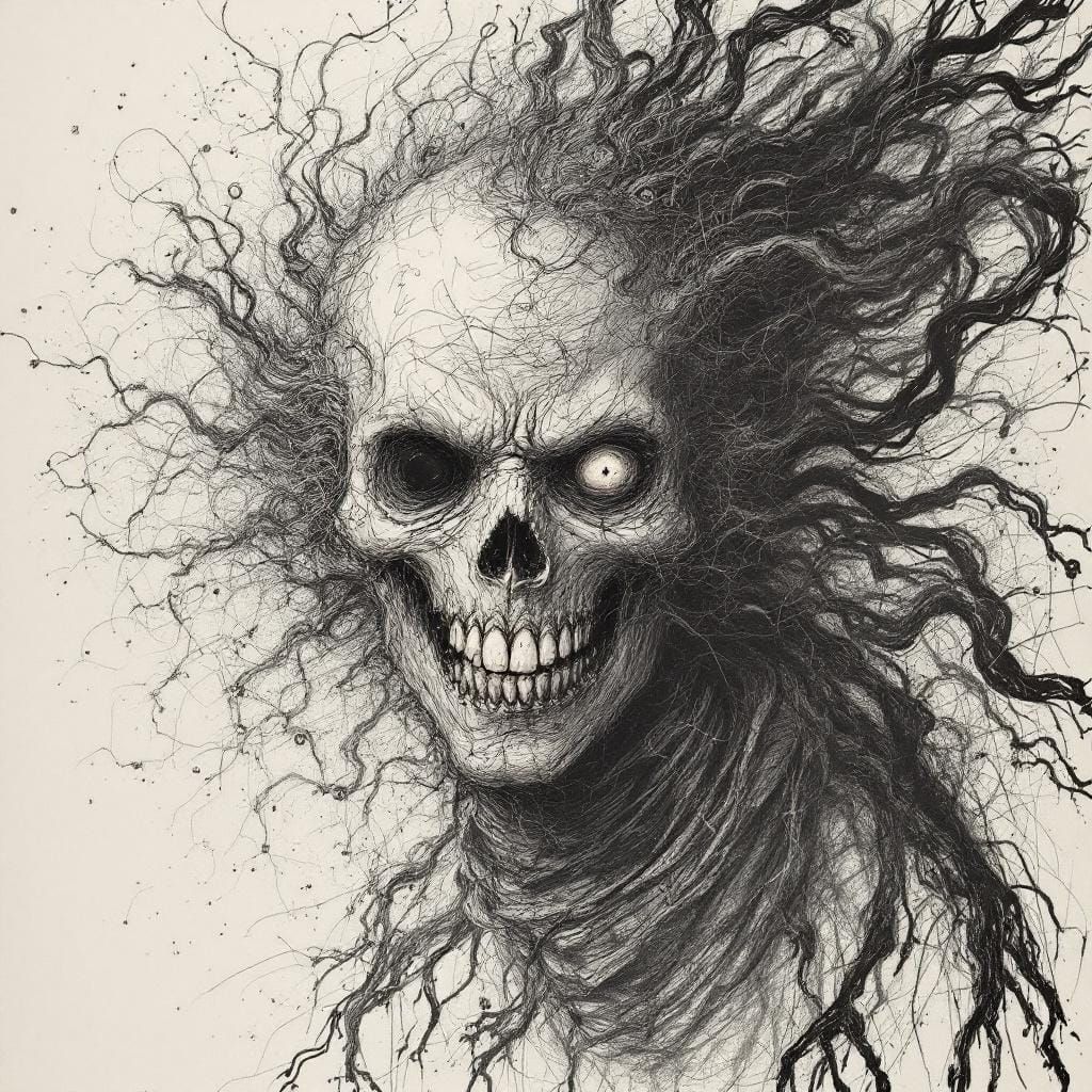 This image shows a supervillain stealing smileys, leaving people crying. The artwork is in the style of a sketch reminiscent of Egon Schiele and Gustave Doré.