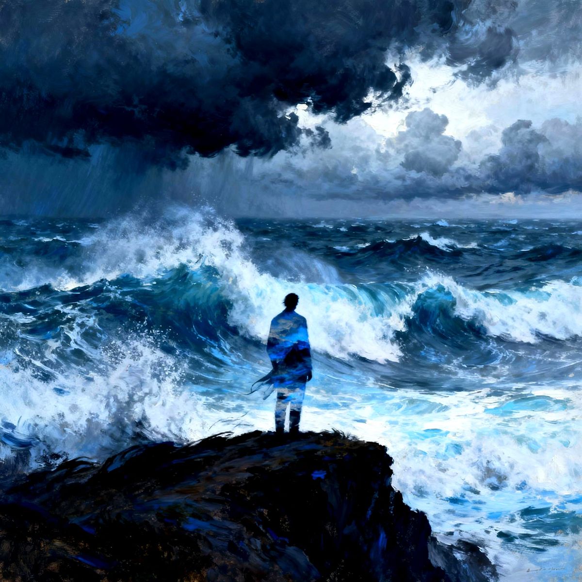 This image features a double exposure portrait of a solitary figure on a cliff, with crashing waves and dark clouds filling their silhouette. It evokes a powerful, melancholic mood in a painterly style.