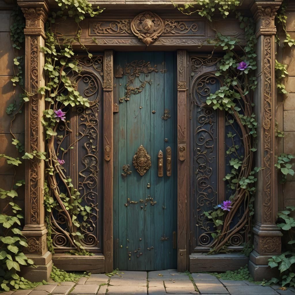 This image shows ancient palace doors adorned with floral ornaments and ivy. The intricate carvings, warm light, and complementary blues, purples, and greens create a photorealistic fantasy scene.