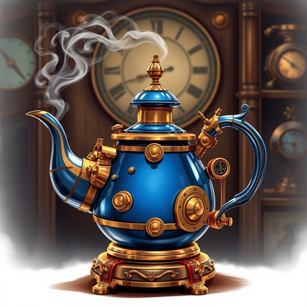 This image showcases an intricately detailed steampunk teapot in rich metallic colors, adorned with gears and gauges. Evokes Victorian ingenuity with its polished brass, copper, and steel construction.