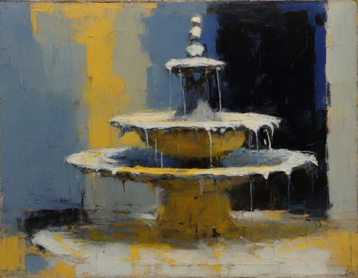 A muted, impressionist oil painting of a decorative water fountain. The artwork features heavy brushstrokes and a textured, grungy aesthetic in dark blue, grey, and black, with accents of cadmium yellow.