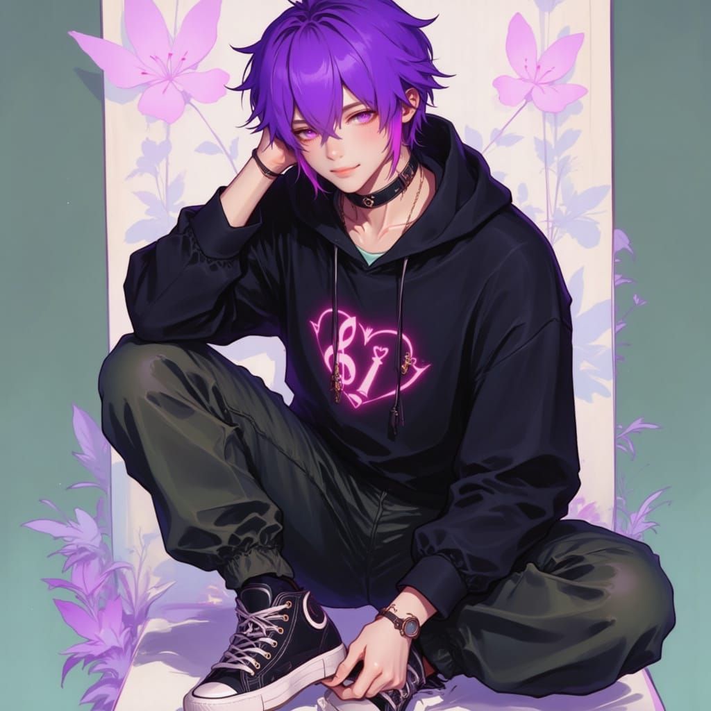 A digital painting of a teenager with vibrant purple hair and glowing tattoo. The character is wearing casual clothing and over-ear headphones, depicted with a mix of digital painting and collage.