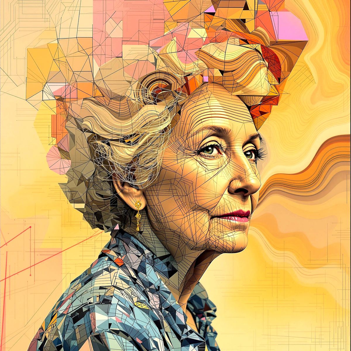 This image features a shy grandmother's portrait with blond hair, overlaid with abstract digital patterns, cosmic webs, and geometric shapes representing deep thought and mental cogitation.