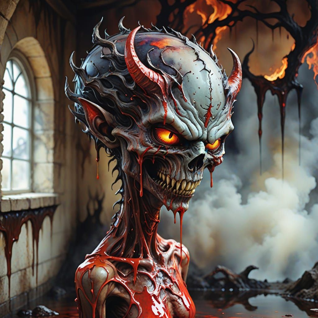 A hyper-realistic photograph of a demon in hell, rendered with brilliant, dripping watercolor liquid for an intricate and elegant scenic view.