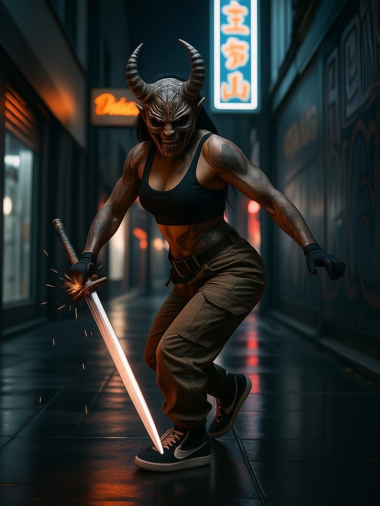 A realistic night photo shows a tattooed female ninja in an urban alley, wearing a Hannya mask. She wields a ninjatō with sparks flying, amidst neon lights and graffiti.