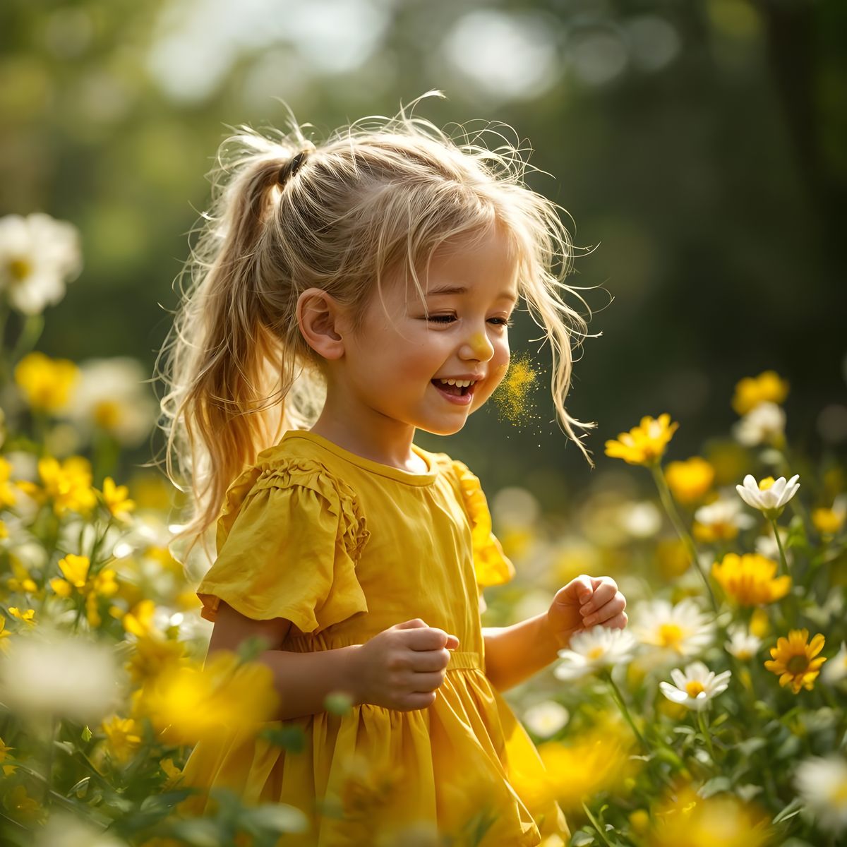A close-up image of a happy blonde girl with a ponytail smelling buttercups. Dynamic lighting, depth of field, and sunshine rays enhance this colorful, intricate artwork.