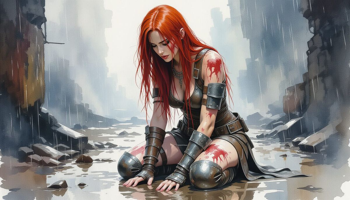 A gritty watercolor and ink image of a woman in tattered armor kneeling in a harsh, rainy environment. The aesthetic blends dark fantasy with hyperdetailed realism.