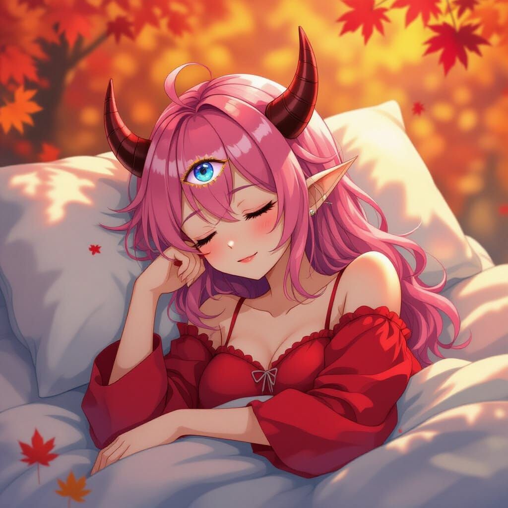 This anime-style image shows a young woman with pink hair and horns, wearing a red nightgown, sleeping peacefully in bed. The scene is set with vibrant autumn foliage, featuring deep colors and cel-shaded textures.