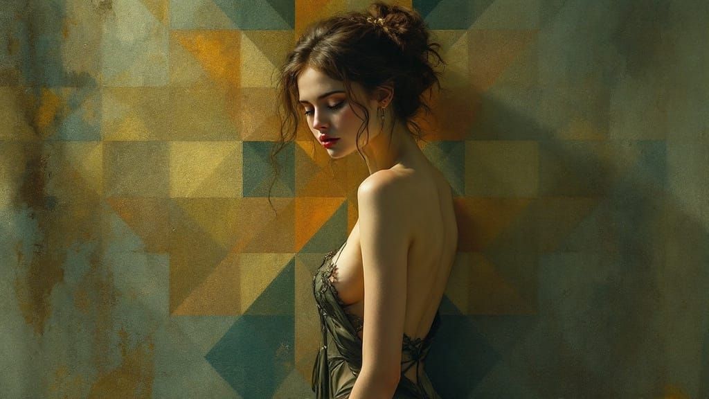 A captivating image of a woman in an indoor setting, showcasing idealized naturalism and soft edges. The artwork features harmonious colors and oil painting techniques, with atmospheric lighting and dramatic shadows.